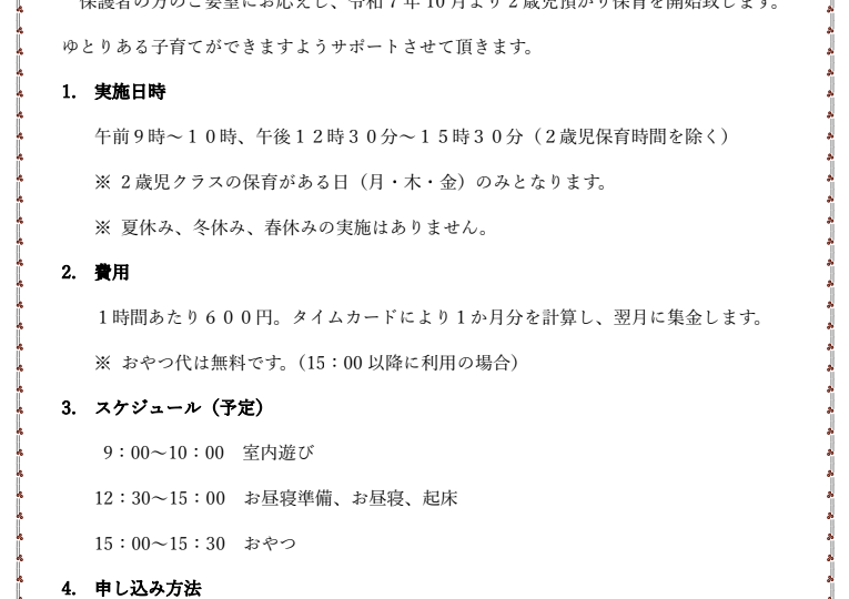 保護者の方のご要望にお応えし、令和 7 年 10 月より 2 歳児預かり保育を開始致します。