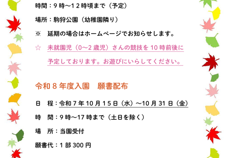 9月 29 2025 運動動会、願書配布、入園面接のお知らせ
